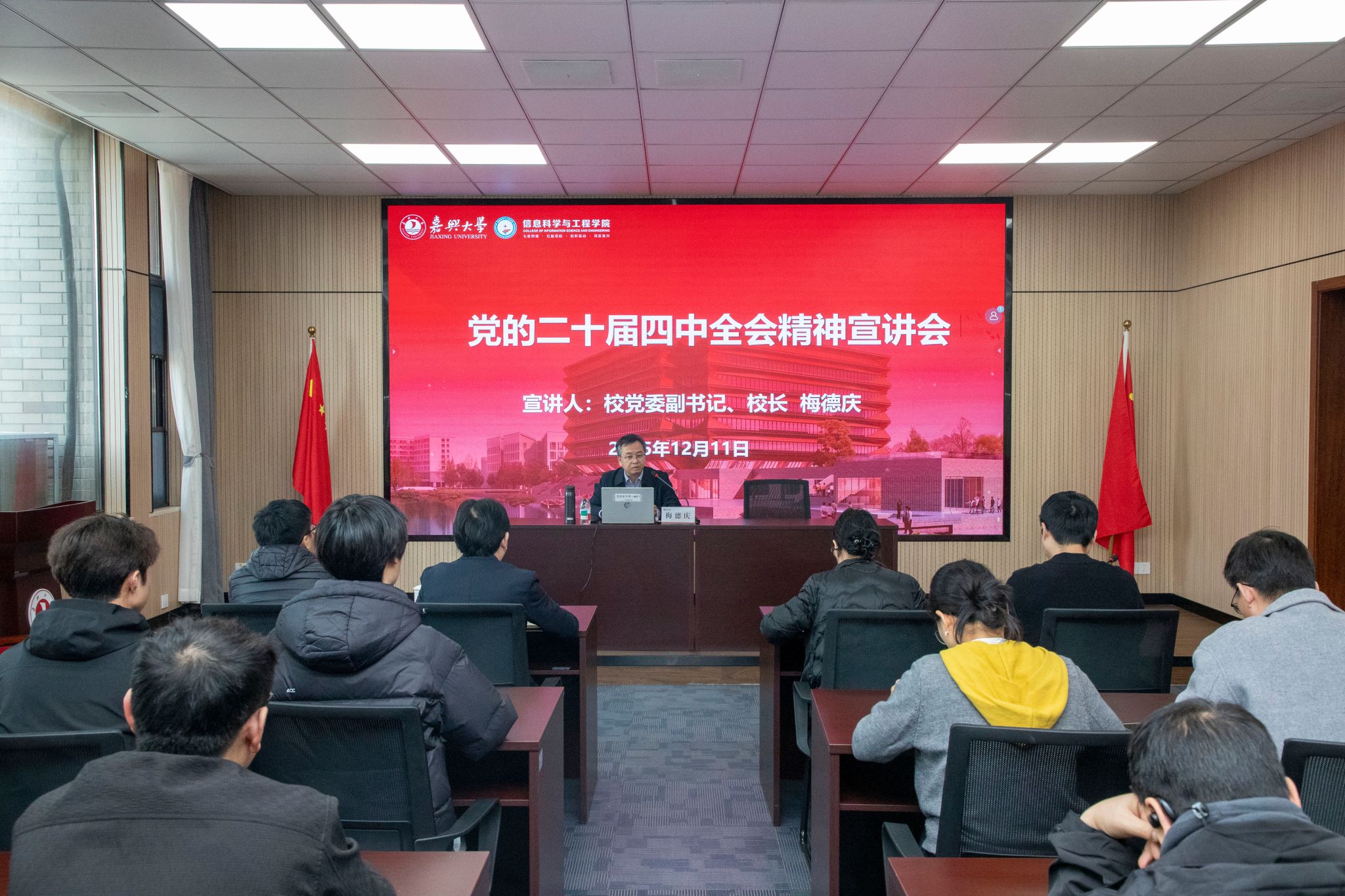 12月11日下午,嘉兴大学校长梅德庆来到信息科学与工程学院,就党的二十届四中全会精神和省委十五届八次全会精神作专题宣讲。信息学院全体党员教师和学生代表参加宣讲会。
