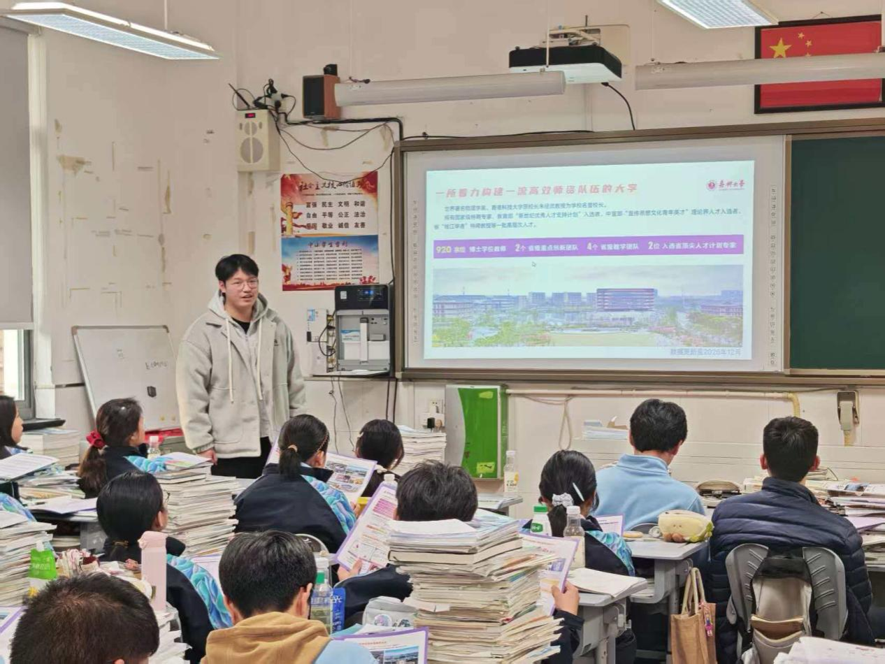 宣讲结束后,印有嘉大标志的笔记本、书签送到学子手中。有学妹小声说:“学姐,我想把笔记本留着,明年考上嘉大再用。”那一刻我们明白,这封“邀请函”,已经有人收到了。